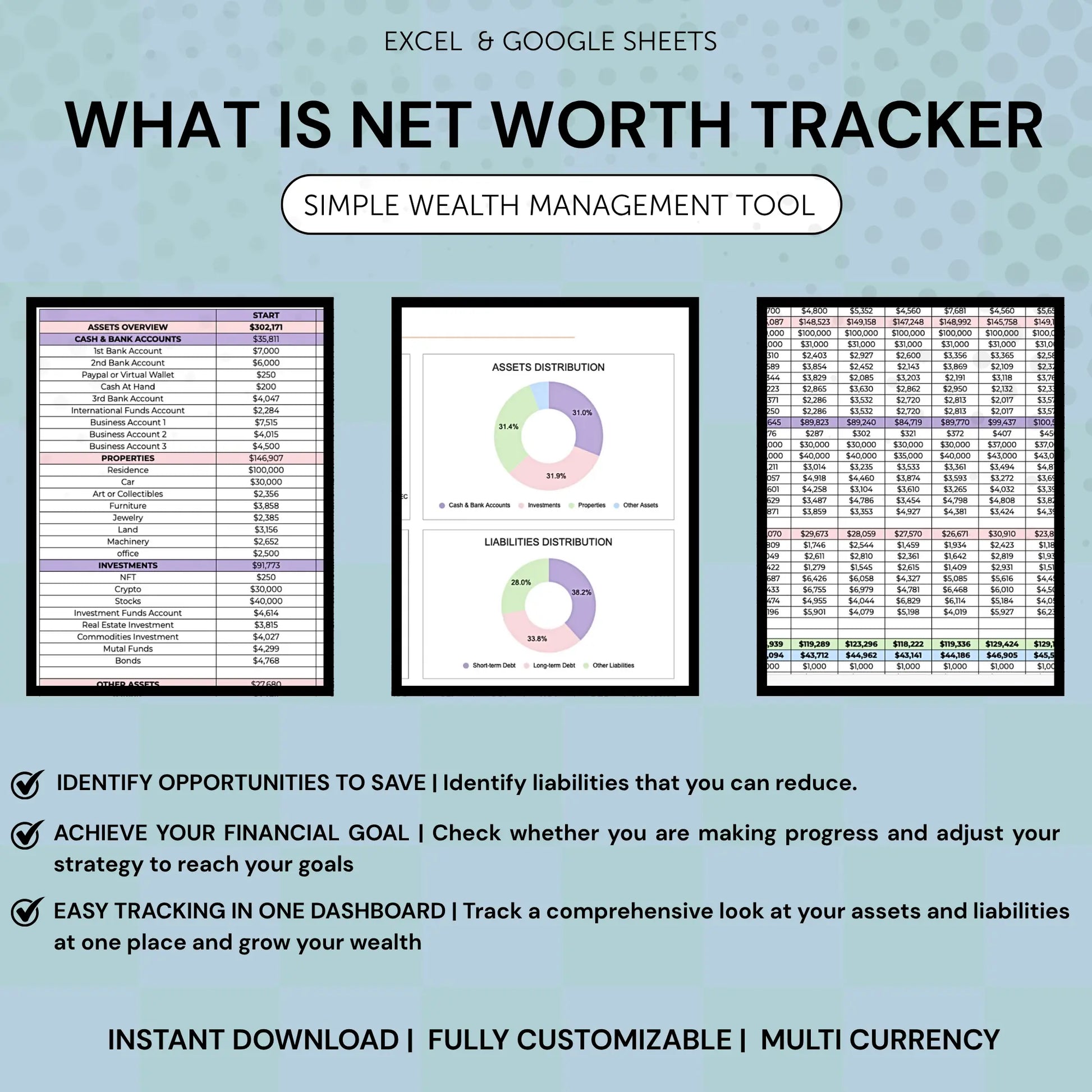 This Net Worth Tracker Spreadsheet combines a detailed asset and liability tracker, net worth calculator, and financial organizer all in one. It serves as both a personal wealth tracker and financial overview tool. Whether you're looking to monitor your progress or build wealth, this tracker supports it all.