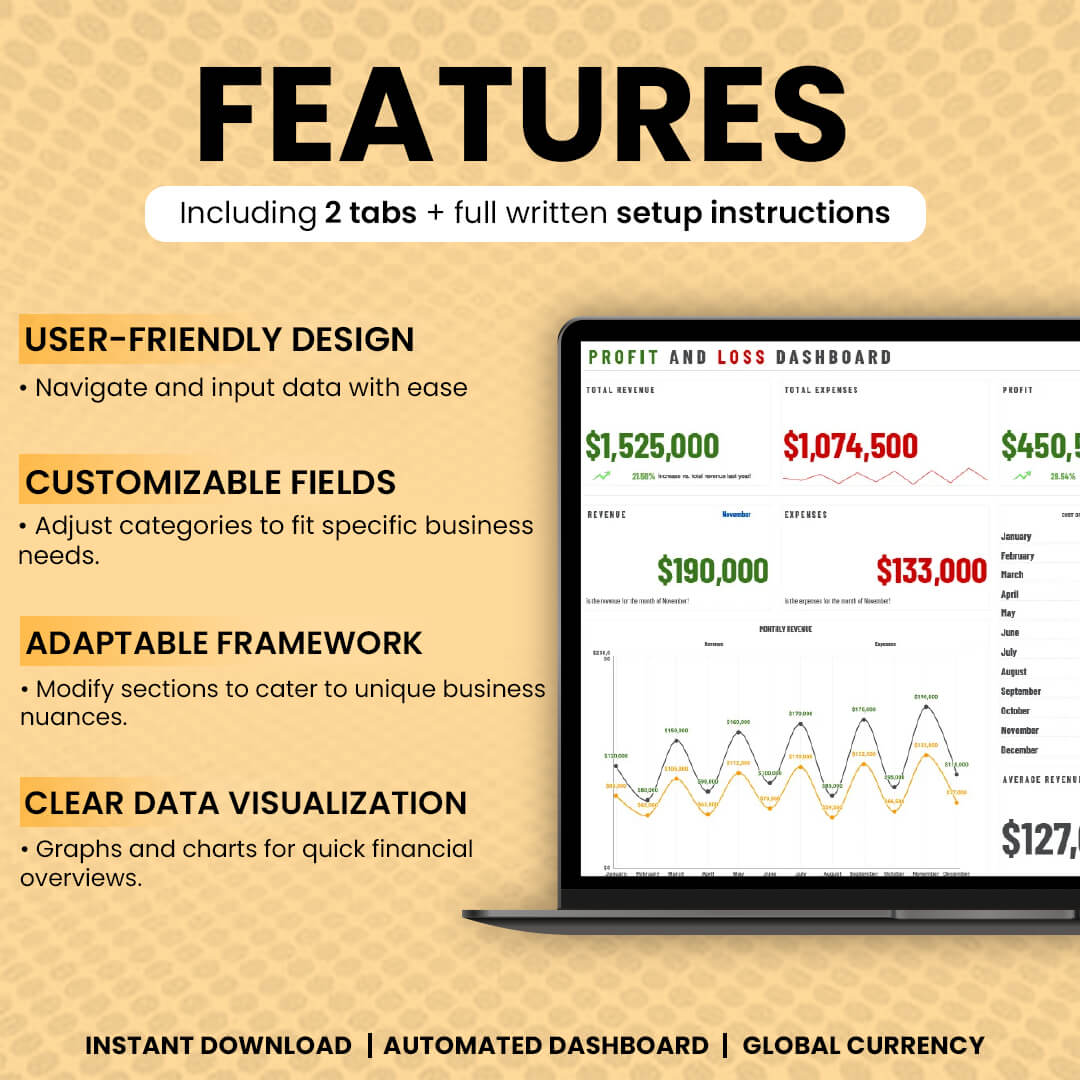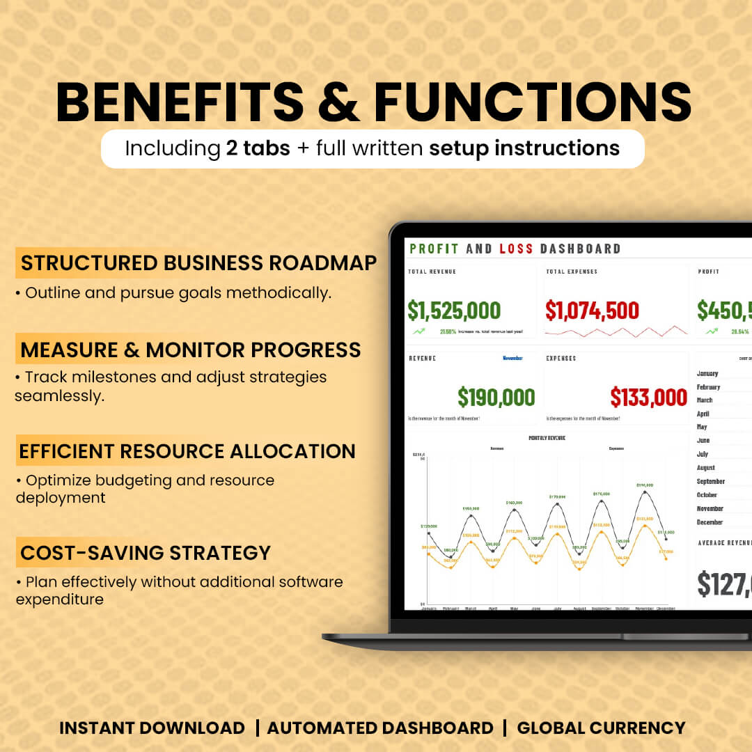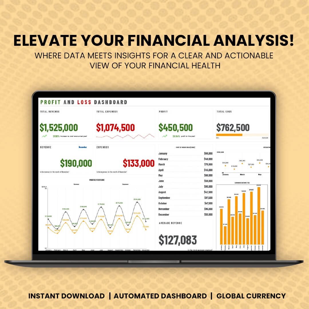 The Profit and Loss Dashboard template is a time and money-saving solution that allows users to keep track of their financial performance with ease. This customizable and printable template eliminates the need to start from scratch. It can also be printed, shared, and accessed on any device and social media platform, making financial reporting hassle-free!