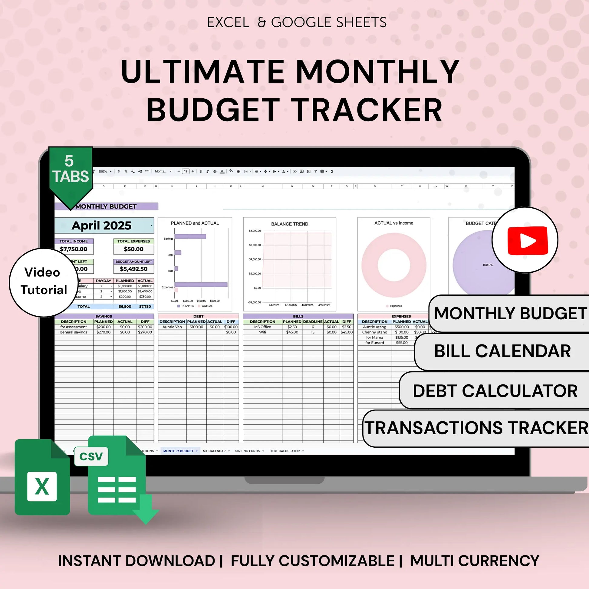 MONTHLY BUDGET - Begin any month! Plan your budget and record all your transactions, including income, bills, expenses, savings, investments, and debt.