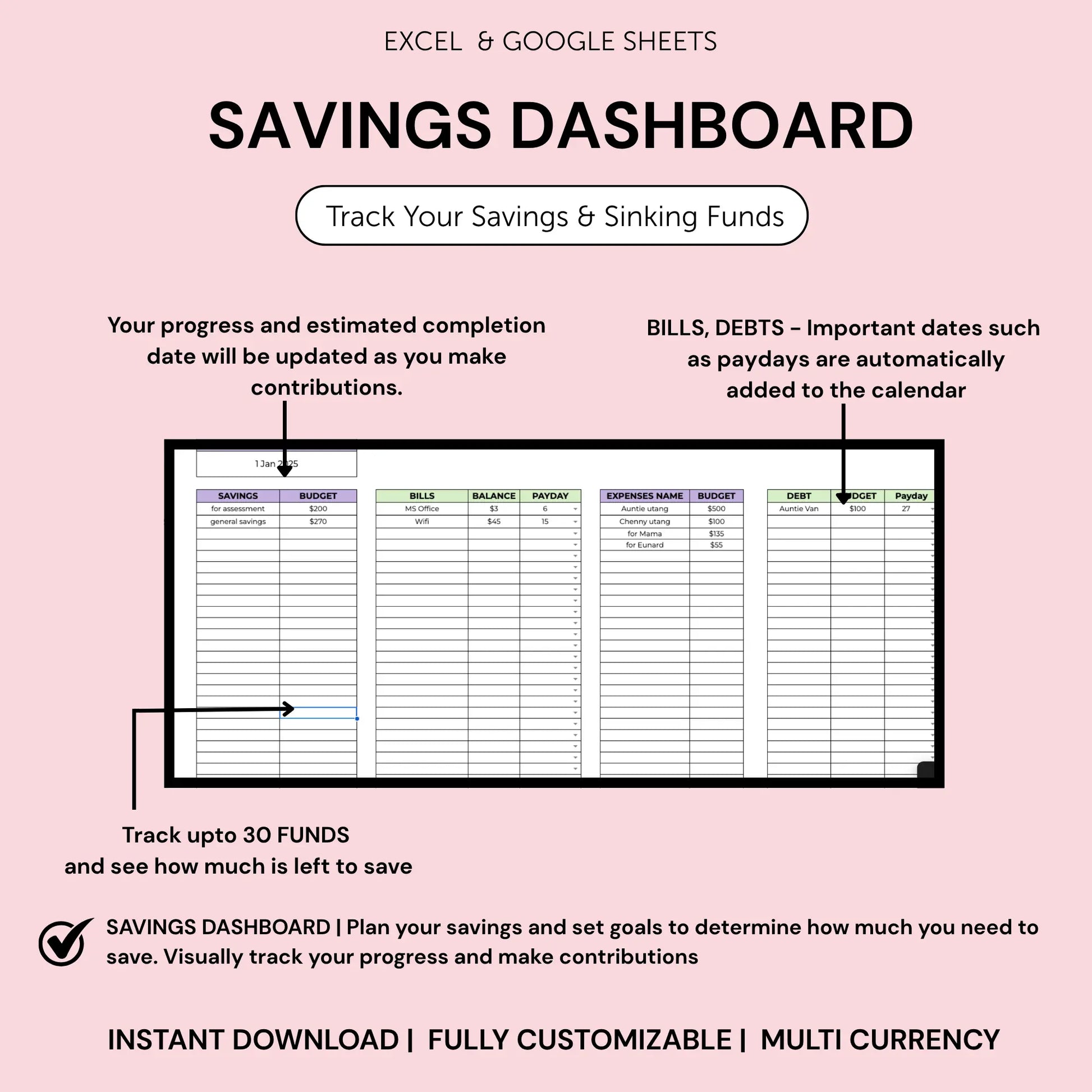 SAVINGS DASHBOARD - Keep track of your savings and sinking funds. Monitor your total contributions and the remaining amount to save.